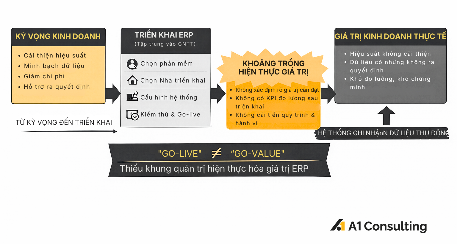 Tại Việt Nam, ERP thường được tiếp cận như một dự án công nghệ thông tin. Doanh nghiệp tập trung nhiều vào việc chọn phần mềm, chọn nhà triển khai, cấu hình hệ thống và kiểm thử kỹ thuật, nhưng lại chưa dành đủ nguồn lực cho việc xác định rõ giá trị kinh doanh cần đạt được và cách đo lường giá trị đó sau triển khai. Khi thiếu một khung Value Realization rõ ràng, ERP dễ trở thành một hệ thống ghi nhận dữ liệu thụ động, phục vụ báo cáo hơn là một công cụ dẫn dắt cải thiện hiệu suất và tăng trưởng.