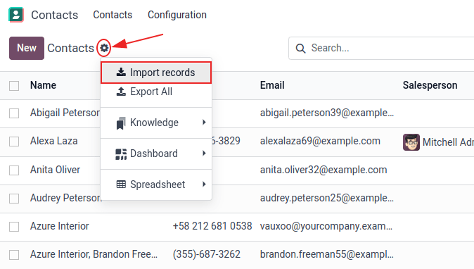 Mở giao diện của đối tượng mà bạn muốn import/điền dữ liệu vào, sau đó nhấp vào biểu tượng bánh răng (⚙) và chọn Import records (Import dữ liệu).