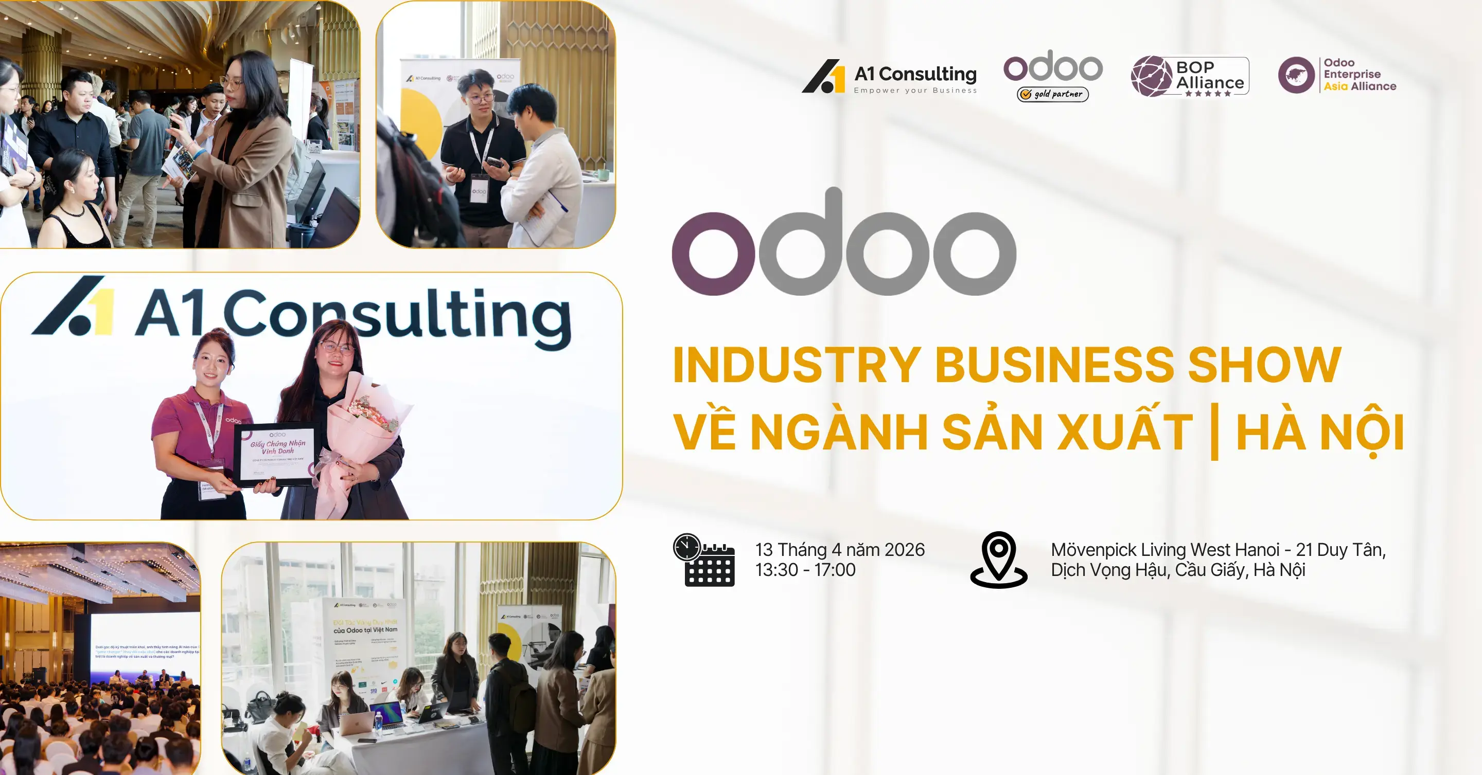 A1 Consulting tự hào là nhà tài trợ chính của sự kiện Odoo Industry Business Show về Sản Xuất tại Hà Nội 2026 – nơi quy tụ các doanh nghiệp sản xuất đang tìm kiếm giải pháp chuyển đổi số hiệu quả, linh hoạt và sẵn sàng cho tăng trưởng dài hạn.